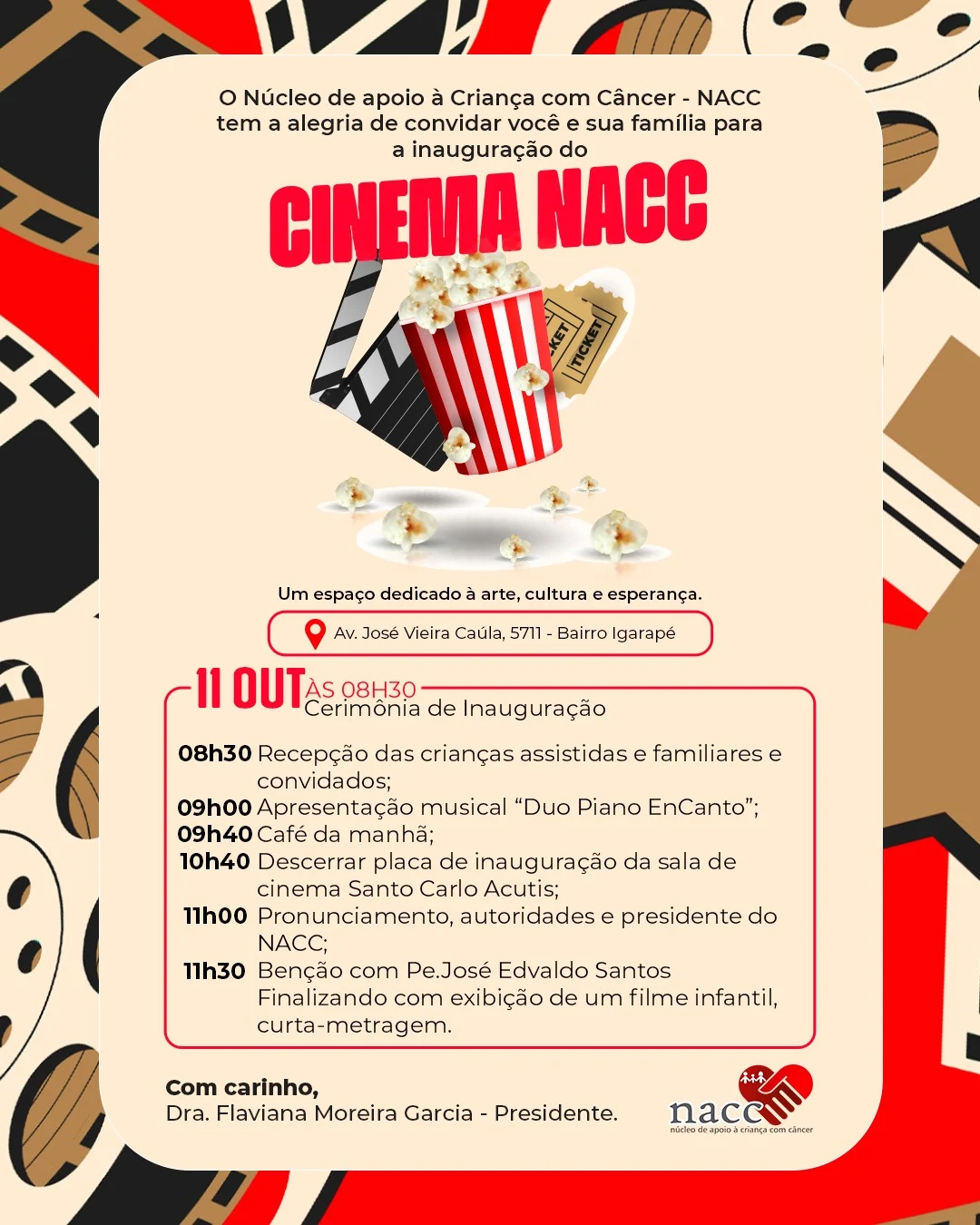 Porto Velho, RO – O Núcleo de Apoio à Criança com Câncer (NACC) convida a imprensa de Porto Velho para a inauguração do Cinema NACC, um espaço dedicado à arte, cultura e esperança, voltado especialmente para as crianças assistidas pela instituição e suas famílias.