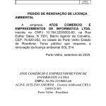 A empresa ATOS COMERCIO E EMPREEDIMENTOS DE INFORMATICA LTDA, inscrita no CNPJ 10.194.225/0002-60, na Rua Esther Sales, N 1501, Bairro Agenor de Carvalho, CEP: 76.820-252, na cidade de Porto Velho Estado de Rondônia. Torna público que requereu a renovação da licença ambiental SOL 514.