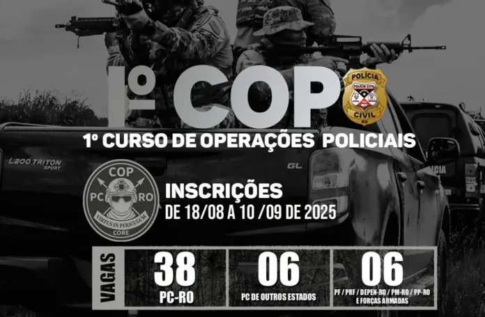 Porto Velho, RO – A Polícia Civil do Estado de Rondônia, por meio da Coordenadoria de Operações e Recursos Especiais (CORE) e da Academia de Polícia Civil (ACADEPOL), publicou edital para o I Curso de Operações Policiais (COP). O processo seletivo disponibiliza 50 vagas destinadas a policiais de diferentes forças de segurança.