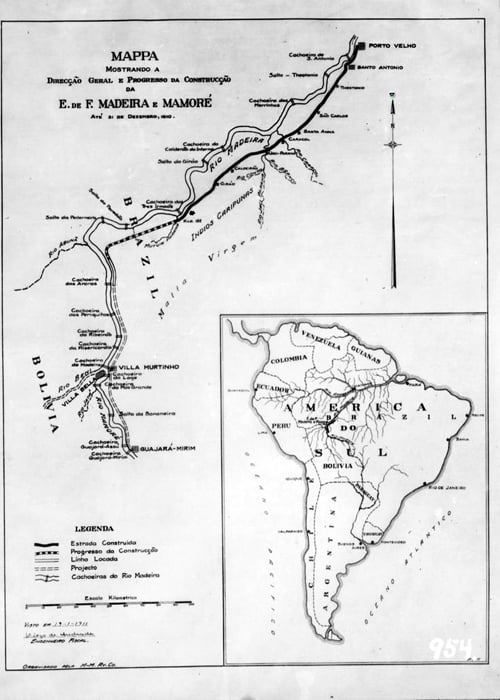 Mapa mostrando a direção geral e progresso da construção da Estrada de Ferro Madeira-Mamoré até 31 de dezembro de 1910. Assinado pelo Engenheiro Fiscal Diogo de Andrade em 19/01/1911. (Foto: Dana Bernand Merril I Arquivo de Luís Claro)