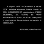 A empresa VIDAL ODONTOLOGIA E SAUDE LTDA, sociedade empresaria limitada, inscrita no CNPJ 46.530.288/0001-07, estabelecida na AV 03 DE DEZEMBRO, SN, CENTRO DE UNIAO BANDEIRANTES, PORTO VELHO-RO. Torna público o recebimento da licença ambiental de operação Nº 462 SOL/DLA.