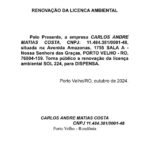 Pelo Presente, a empresa CARLOS ANDRE MATIAS COSTA, CNPJ: 11.484.381/0001-48, situada na Avenida Amazonas, 1755 SALA A – Nossa Senhora das Graças, PORTO VELHO – RO, 76804-159. Torna público a renovação da licença ambiental SOL 224, para DISPENSA.